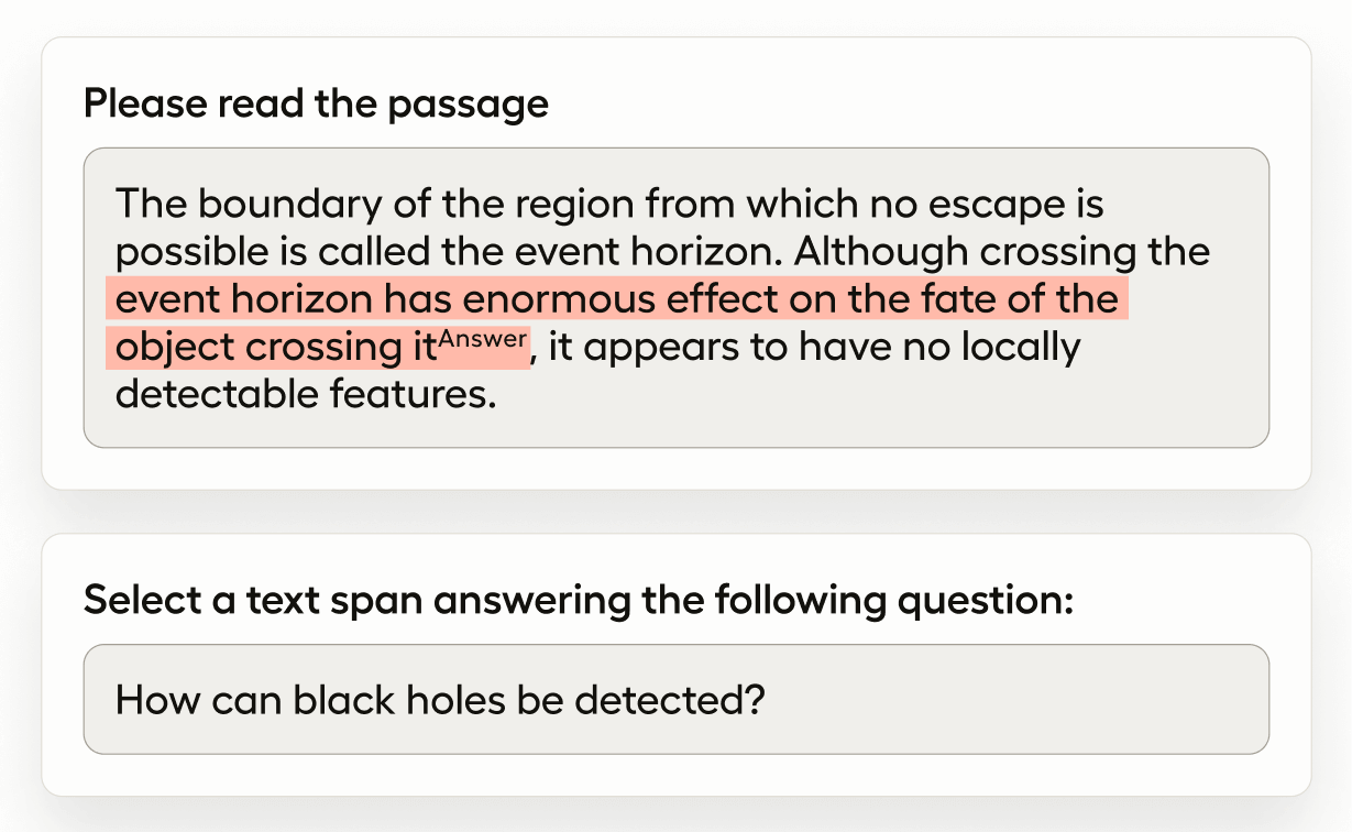 If you want to train a question answering machine learning model, use this template to develop a dataset. This template prompts annotators to read a passage of text, then highlight the span of text that answers a specific question.