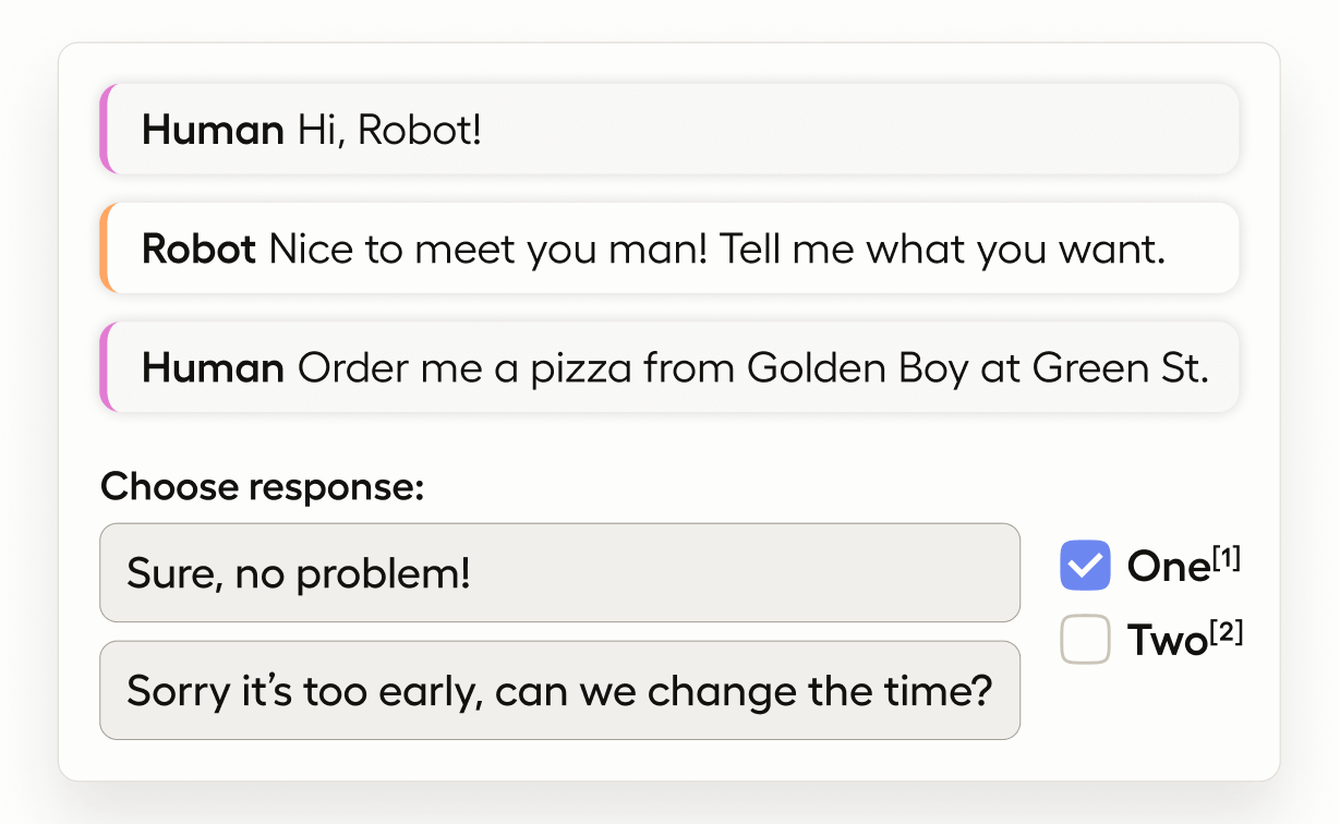If you want to refine the best response for a conversational AI use case, you can provide already-generated responses to annotators and have them choose the best one.